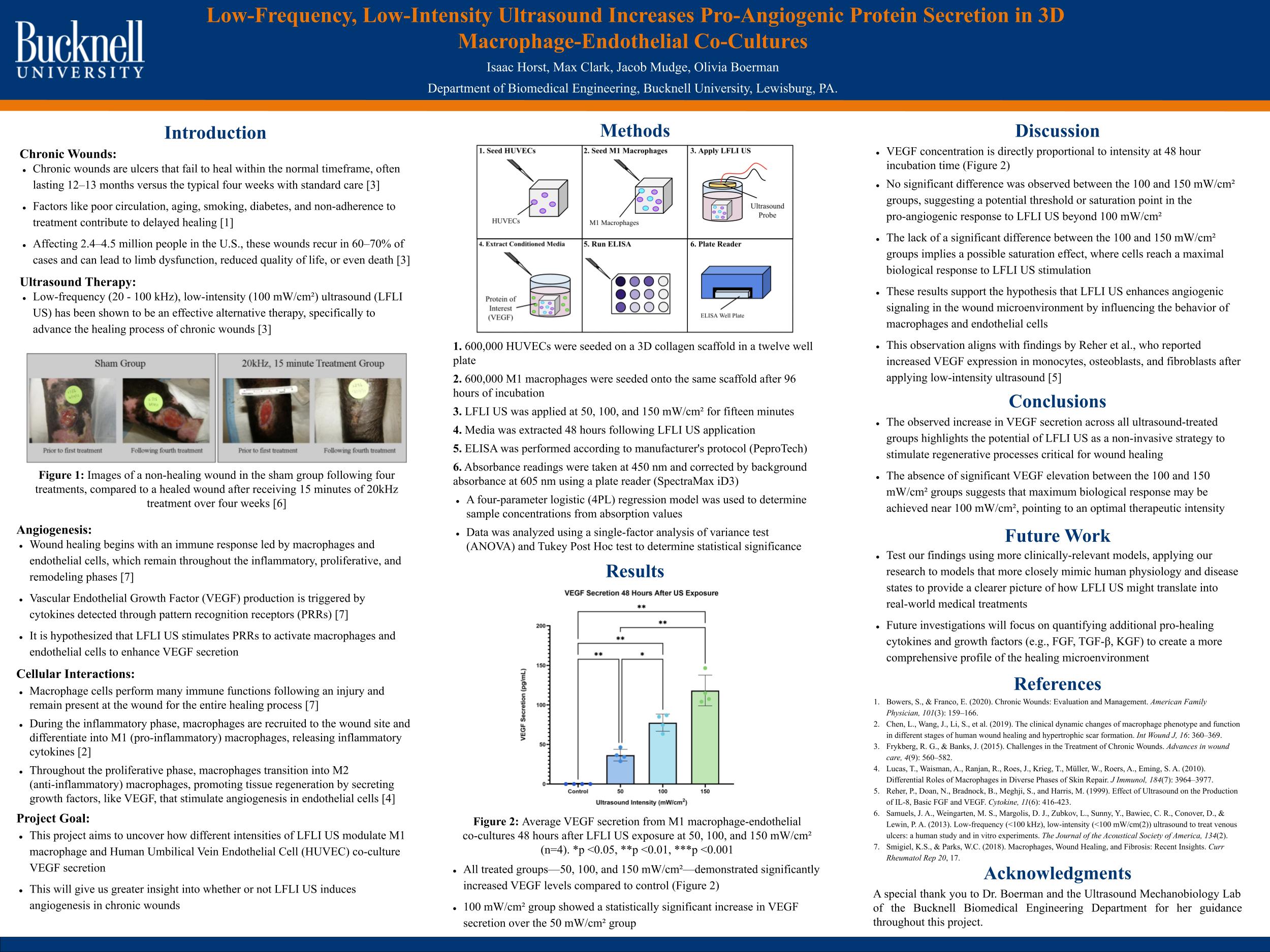 Ultimately, these findings demonstrate that LFLI US can effectively shift the wound environment toward a pro-healing phenotype by modulating the behavior of key immune and vascular cells. This study provides a foundational framework for using ultrasound as a non-invasive tool to accelerate tissue regeneration. Future research will likely expand on these results by exploring macrophage polarization and testing more complex, clinically relevant models to further validate LFLI US as a viable treatment for chronic ulcers.
