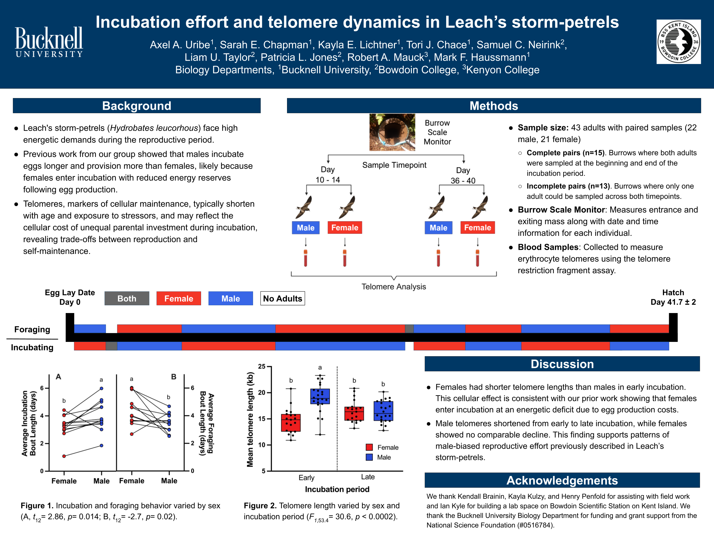 Avian embryos cannot regulate their own temperature, necessitating parental thermal buffering to stabilize developmental conditions throughout incubation. Many pelagic seabird pairs take turns between incubation and foraging during the breeding period. However, because of unpredictable food resources and fluctuating environmental conditions, breeding pairs often differ in how they divide parental tasks. This variable parental care during the incubation period may impose a physiological cost, which can be investigated using cellular biomarkers. Telomeres—the protective, terminal caps on linear chromosomes—are one biomarker of organismal cellular health. In previous studies of seabirds, shorter telomeres have been linked to improved reproductive performance, which could suggest that decreased energy expenditure towards self-maintenance has a cellular cost on telomeres. Here, we examine the impact of incubation effort on telomere dynamics in Leach’s storm petrels (Hydrobates leucorhous). To assess changes in telomere length, blood samples were collected from adults approximately 10 days post-egg lay date and 3 days before expected hatch date (average incubation period: 41.7 2 days). Erythrocyte telomere length was measured using the telomere restriction fragment assay. We will discuss telomere length changes at both the individual and pair level to evaluate how incubation effort may trade off with somatic maintenance. This study improves our understanding of the physiological costs of parental investment during incubation, with potential long-term effects on organismal physiology and future reproductive outcomes.