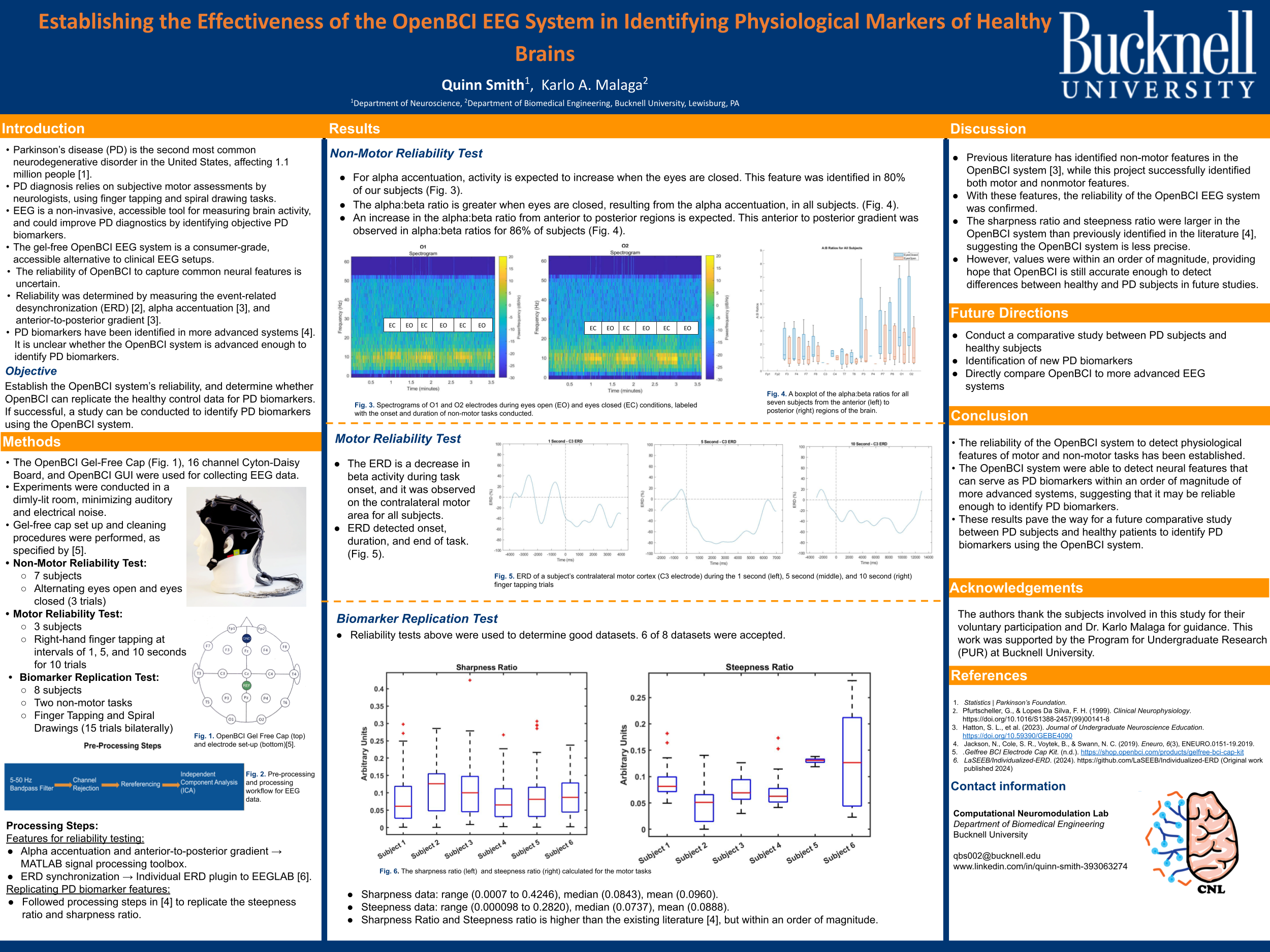 Parkinson disease (PD) is the second most common neurodegenerative disorder in the United States, affecting 1.1 million people. However, ~20% of PD patients are misdiagnosed because diagnosis often relies on subjective motor assessments by doctors. Electroencephalography (EEG) is a non-invasive, accessible tool that records neural activity using electrodes placed on the scalp, and can be used to improve diagnostics with objective neural biomarkers of PD. The cognitive neuromodulation lab bought the OpenBCI EEG system last spring, and this project sought to identify the reliability of the system. Three experiments were conducted with healthy volunteers. The data for each experiment was preprocessed using EEGLAB to isolate neural data from electrical noise. Then, MATLAB’s signal processing toolbox was used to extract the neural features. The first two experiments looked for robust neurological biomarkers of health data identified with more advanced EEG systems. With subjects alternating between eyes open and eyes closed states in the first experiment and performing thirty trials of finger tapping in the second experiment, two nonmotor biomarkers and one motor biomarker were successfully identified. The third experiment had patients perform finger tapping and spiral drawing, bilaterally, replicating motor tasks in PD assessments. With this data, three biomarkers known to differ between PD and healthy subjects were identified in this healthy cohort, consistent with the data in the literature. Having identified these biomarkers, the reliability of the OpenBCI system is verified and a comparative study between healthy subjects and PD patients will be conducted to identify novel PD biomarkers.