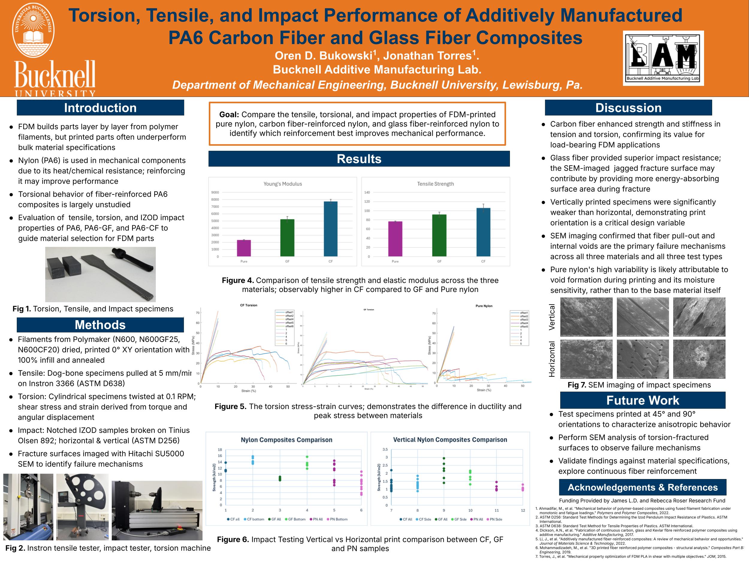 Additive manufacturing (AM) using fused deposition modeling (FDM) is increasingly applied to fiber-reinforced polymers, yet comprehensive experimental evaluation of their mechanical behavior remains limited. This study expands prior work on carbon-fiber (CF) and glass-fiber (GF) reinforced nylon by investigating the influence of print parameters, annealing conditions, and filament type on the tensile, fatigue, and torsional performance of reinforced and pure nylon specimens. Test coupons were iteratively fabricated using a dual-nozzle FDM system, with process refinements implemented to address support-material adhesion, filament moisture, and print variability. Mechanical properties, including tensile strength, Young’s modulus, ductility, and torsional resistance, were extracted through standardized testing and custom data-analysis methods. Results indicate that appropriate annealing improves consistency in CF and GF composites, though GF specimens exhibited higher print failure rates. Pure nylon demonstrated high ductility and irregular fracture behavior, likely influenced by moisture absorption and thermal history. Measured elastic moduli were generally lower than manufacturer specifications, suggesting sensitivity to testing conditions and strain measurement methods. Torsional testing showed the greatest reproducibility in pure nylon, while chopped carbon-fiber reinforcement provided the strongest resistance to torsional deformation and fracture. Overall, significant variability across all materials highlights the strong dependence of mechanical performance on processing conditions. These findings contribute to improved understanding and optimization of FDM-printed nylon composites for structural applications.