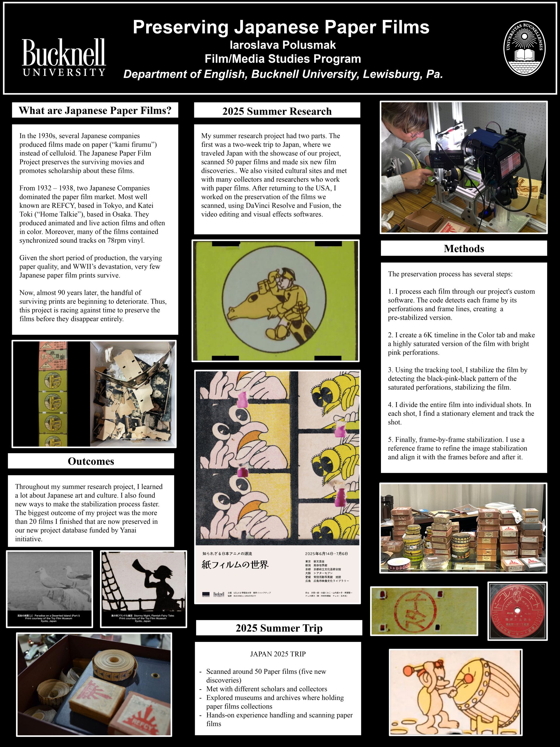 My summer research project had two parts. The first was a two-week trip to Japan, where we traveled Japan with the showcase of our project, scanned 50 paper films and made six new film discoveries.. We also visited cultural sites and met with many collectors and researchers who work with paper films. After returning to the USA, I worked on the preservation of the films we scanned, using DaVinci Resolve and Fusion, the video editing and visual effects softwares.